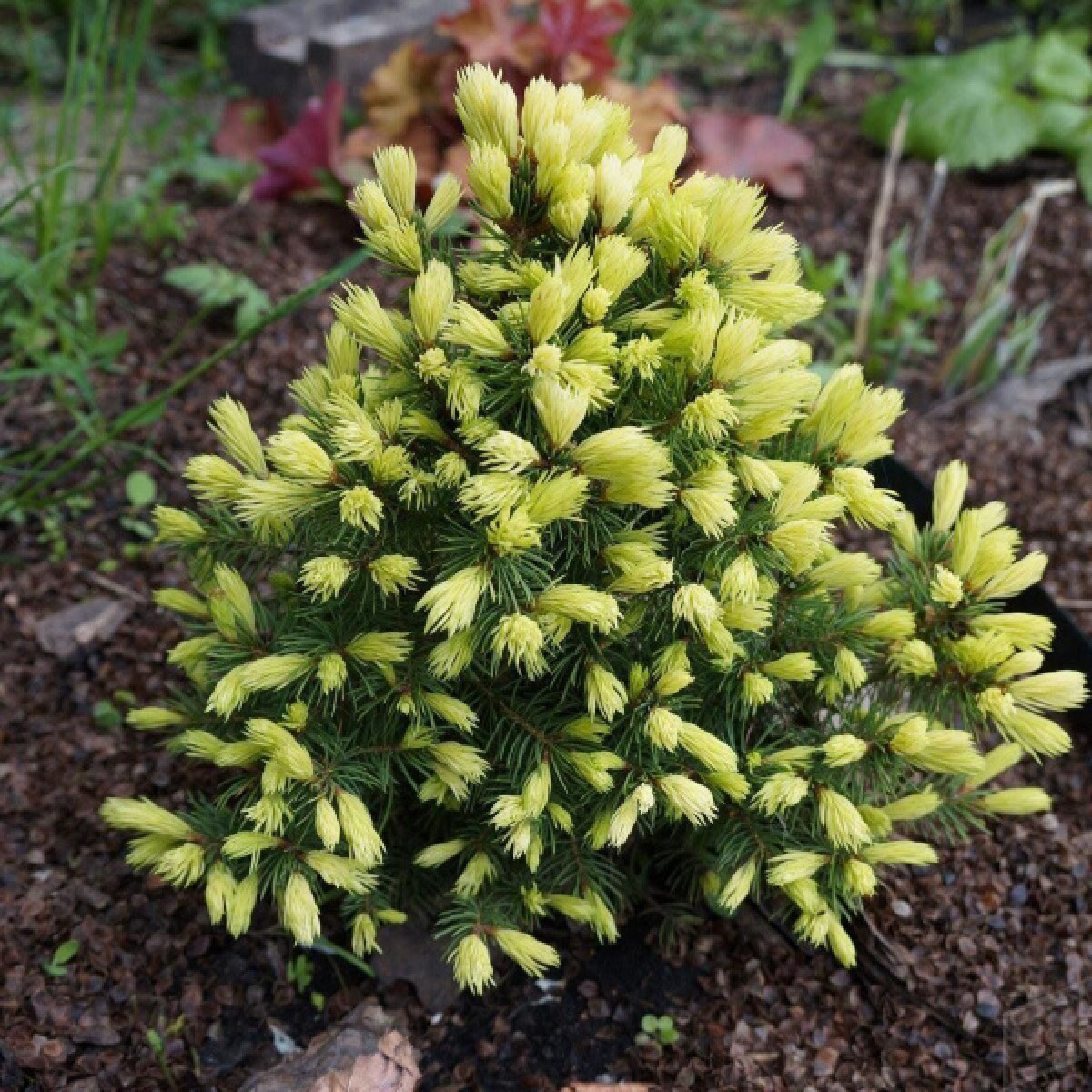 Ель канадская Рэйнбоуз Энд - невысокий конус с кремовыми приростами и очень мягкой на ощупь кроной. Она подходит для создания групп из низкорослых хвойных и невысоких кустарников, как дополнение в цветниках и рокариях. Великолепно себя показывает около водоемов.