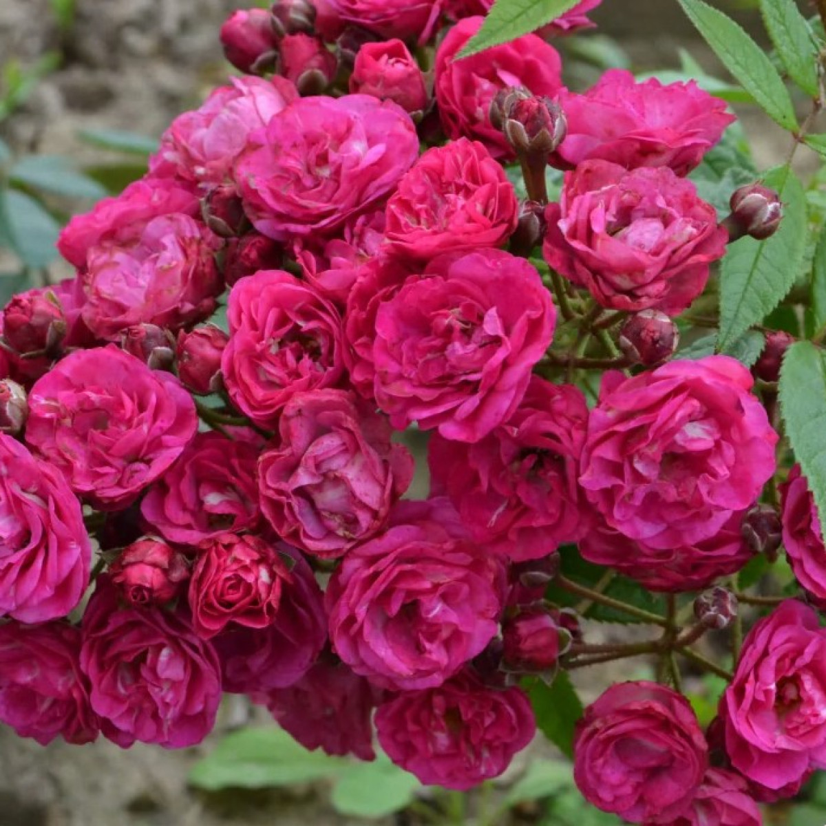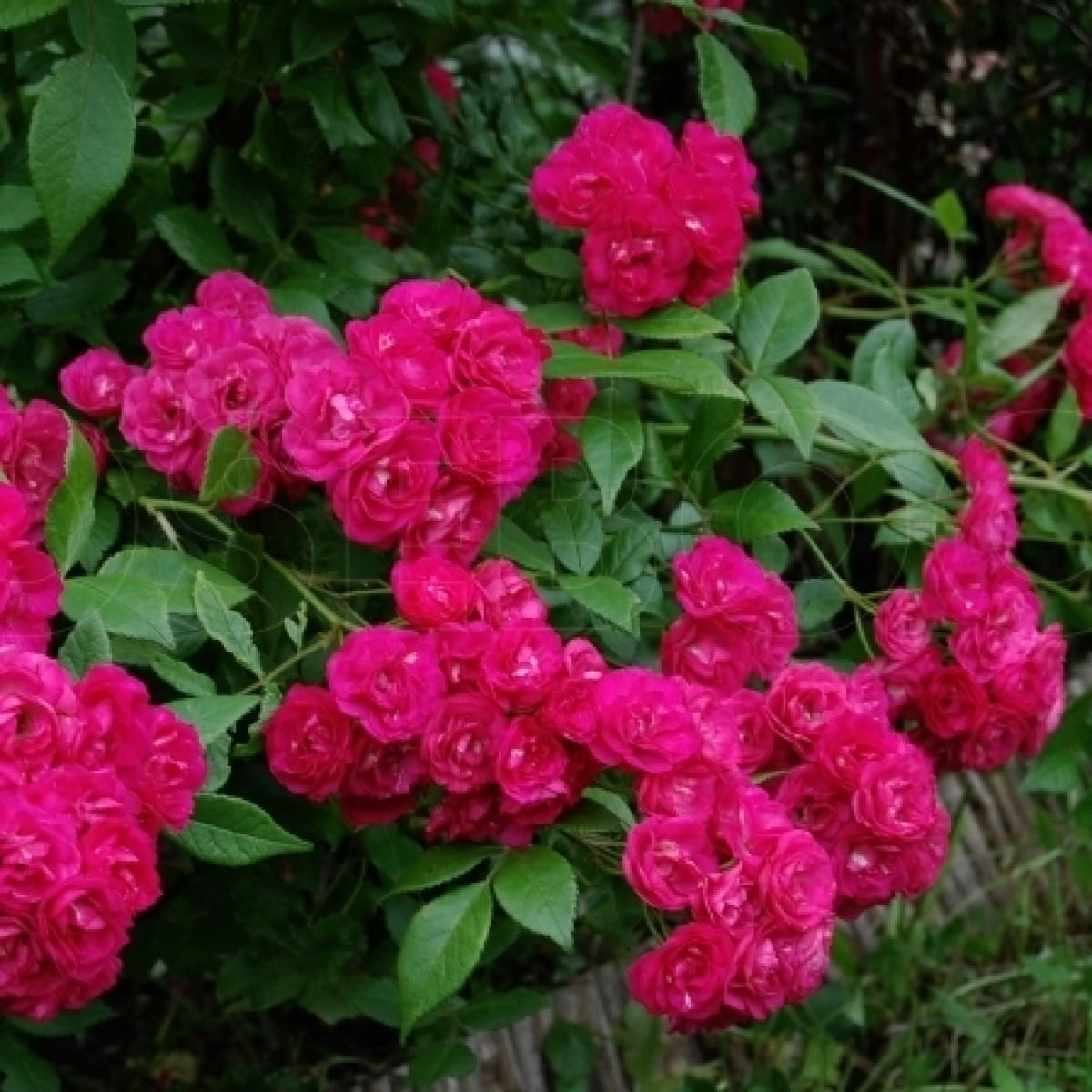 Куст достигает в высоту около 100-120 см (по отзывам может достигать 200 см) и разрастается до 120 см (по отзывам может достигать 200 см).Крона вертикальнорастущая, кустистая, состоящая из арковидных, лазящих побегов. Листва крупная, зеленая, полублестящая. Сорт прекрасно размножается отводками и черенкуется.Цветение обильное, непрерывное до наступления морозов. Цветки среднего размера, собраны в грозди по 5-10 шт на стебле и окрашены в насыщенный розовый цвет. Они махровые (17-25 лепестков в каждом) способны достигать 4-5 см в диаметре. Обладают мягким тонким ароматом. Цветочки держатся до недели.