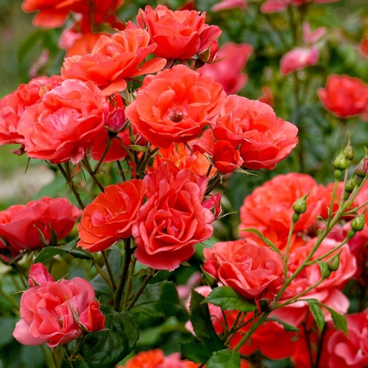 В одном соцветии образуется до 10 миниатюрных цветов карминно-красного оттенка диаметром 4-6 см, благоухающих легким нежным ароматом. Цветение обильное, цветет в течении всего сезона. Стебли в длину достигают до 1,5 м, по мере роста поникают на землю, диаметр куста при этом может доходить до 100 см. В срезке сорт этой розы почти не используется, зато идеален для озеленения клумбы.