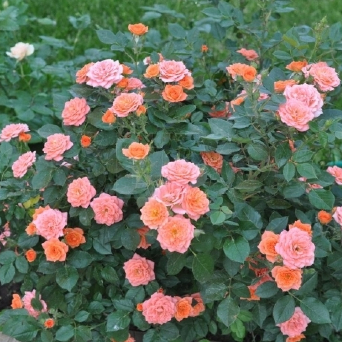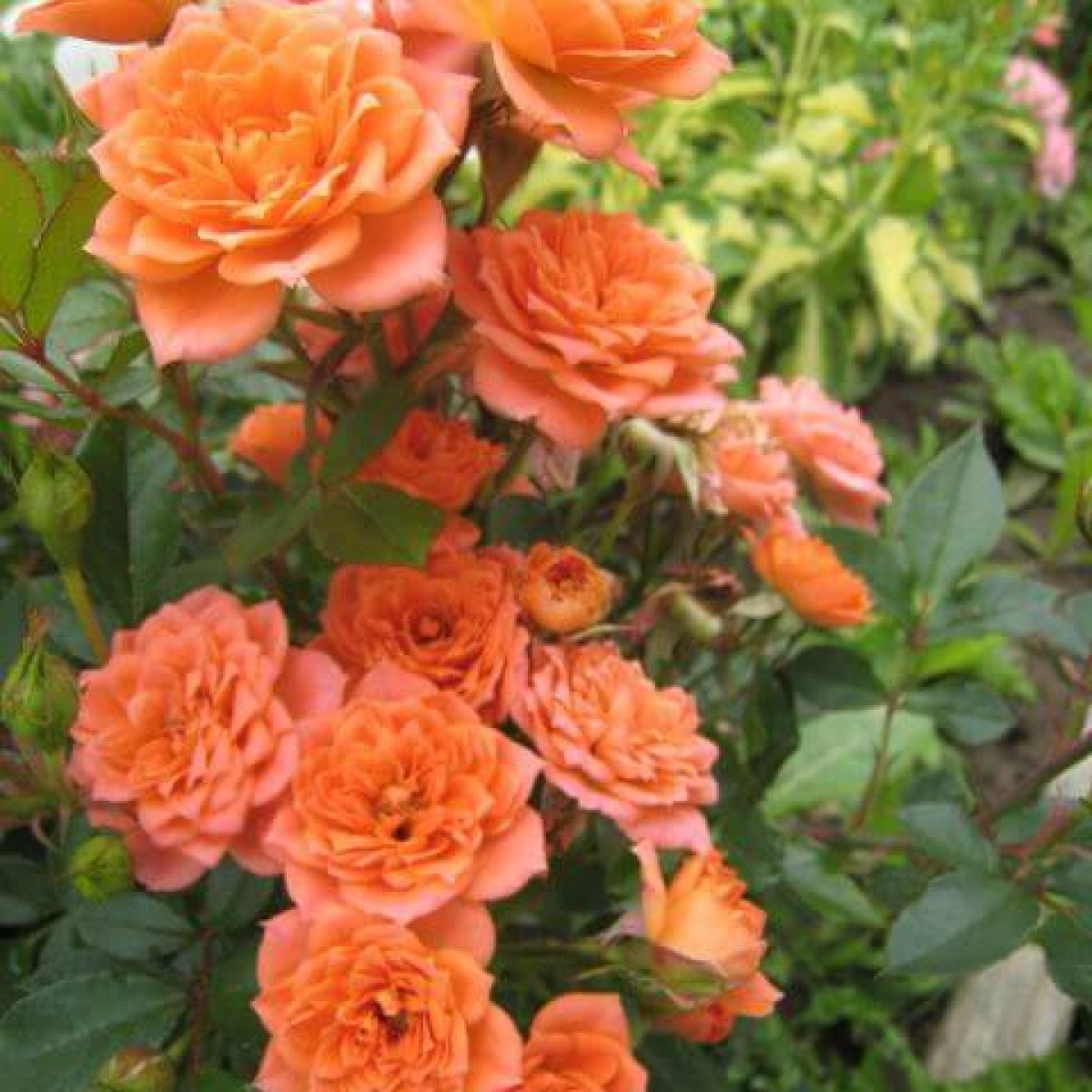Роза Нинетта - Цветок темно-оранжевый, при распускании становится персиковым, розетковидный, махровый (39 - 55 лепестков), обладает легким ароматом. Диаметр 4-5 см. Цветение обильное, непрерывное, цветки собраны в соцветия, на одном цветоносе в период массового цветения насчитывается 5-10 цветков одновременно. Растение мощное, густое, высота куста 30-40 см, ширина 40 см. Лист оливково-зеленый, мелкий, глянцевый.
