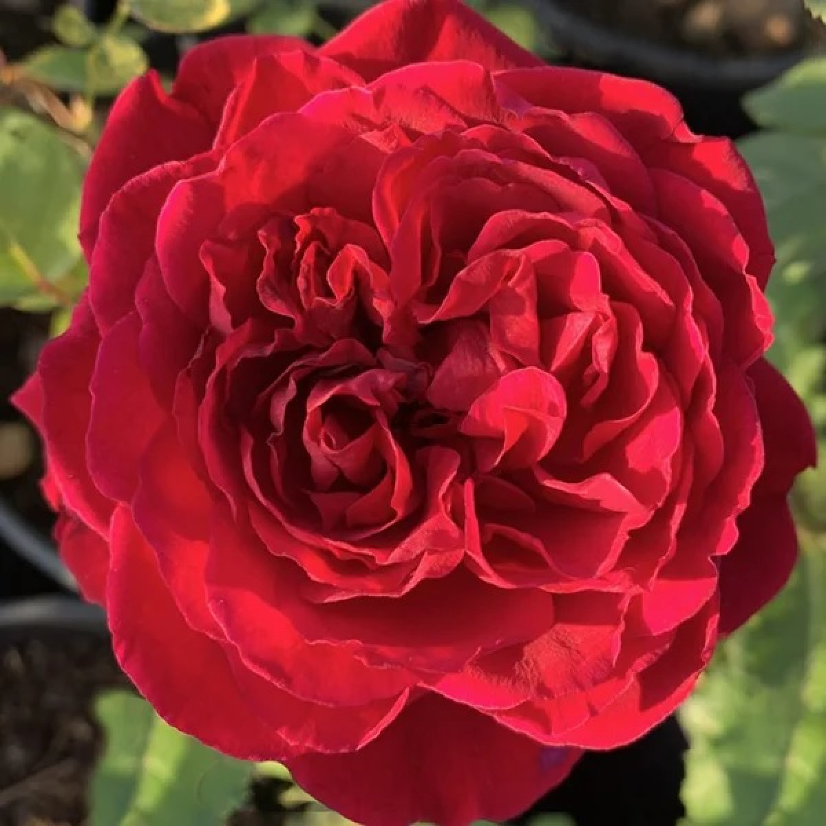 · Цветки: густомахровые, блюдцевидной формы, диаметром около 7 см. Состоят из 120 лепестков, имеют тёмно-красный оттенок с красно-фиолетовым отливом на нижней стороне. В центре цветка видны золотистые тычинки.