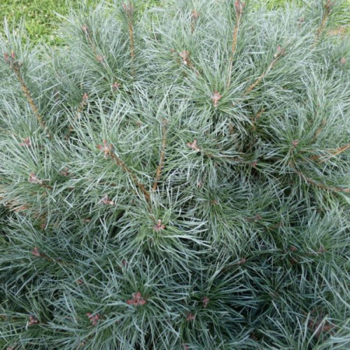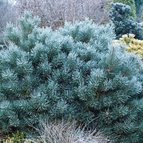 Побеги направлены вверх либо под углом вверх. Хвоя - длинная, мягкая, на солнечных участках голубая, а в затененных местах может приобретать также зеленоватый оттенок. Малочисленные шишки, образуются только на взрослом растении. По форме шишки яйцевидные, длиной 3-7 см, серовато-бурые (в созревшем состоянии), располагаются одиночно или группами, на загнутых вниз ножках.