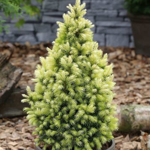 Ель канадская "Daisy's White" – миниатюрная канадская елочка с правильной конусовидной кроной, окрашенной в яркий салатово-зеленый цвет с легким оттенком желтого.