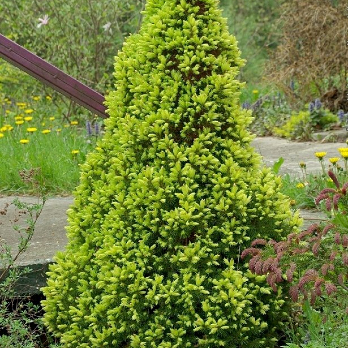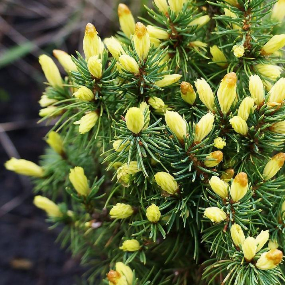 Ель канадская Рэйнбоуз Энд - невысокий конус с кремовыми приростами и очень мягкой на ощупь кроной. Она подходит для создания групп из низкорослых хвойных и невысоких кустарников, как дополнение в цветниках и рокариях. Великолепно себя показывает около водоемов.