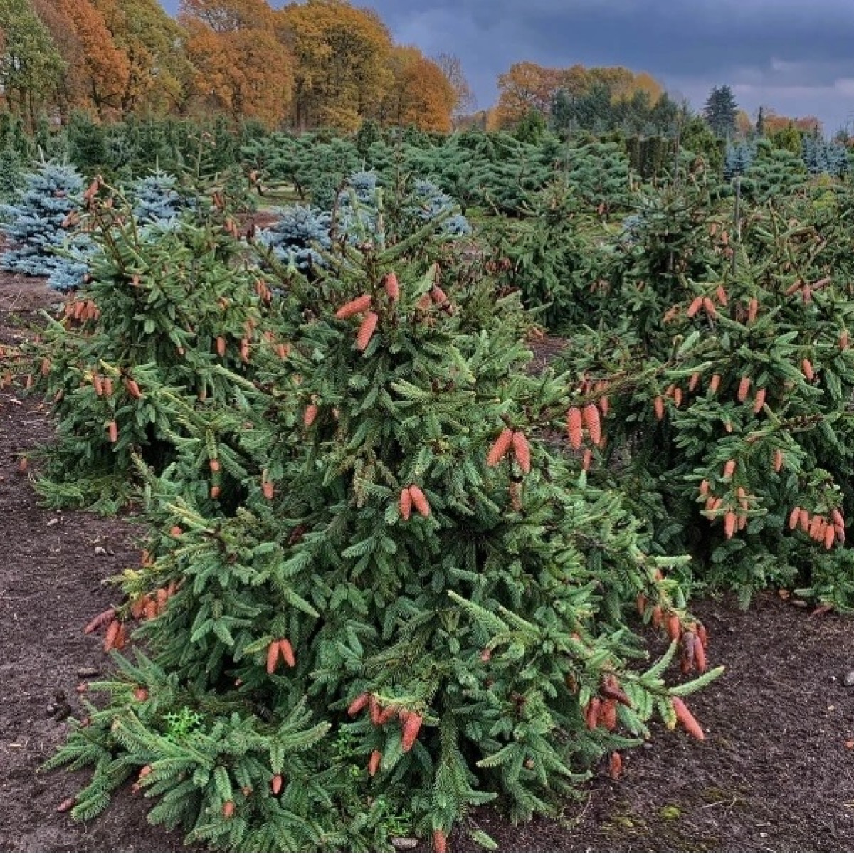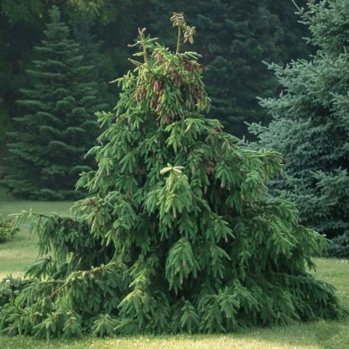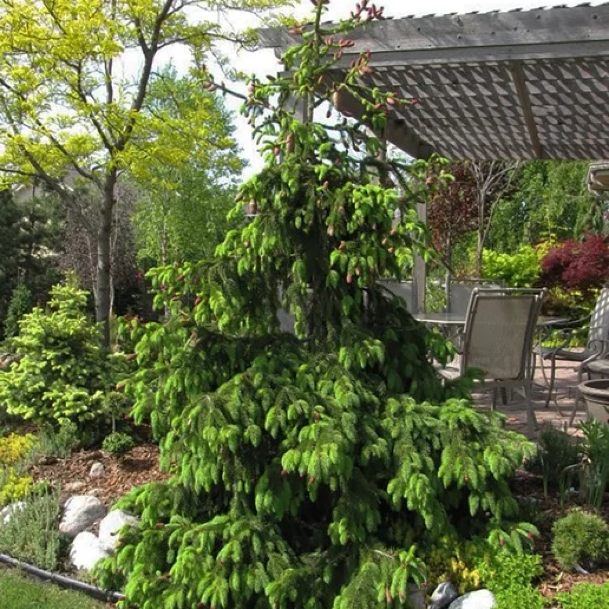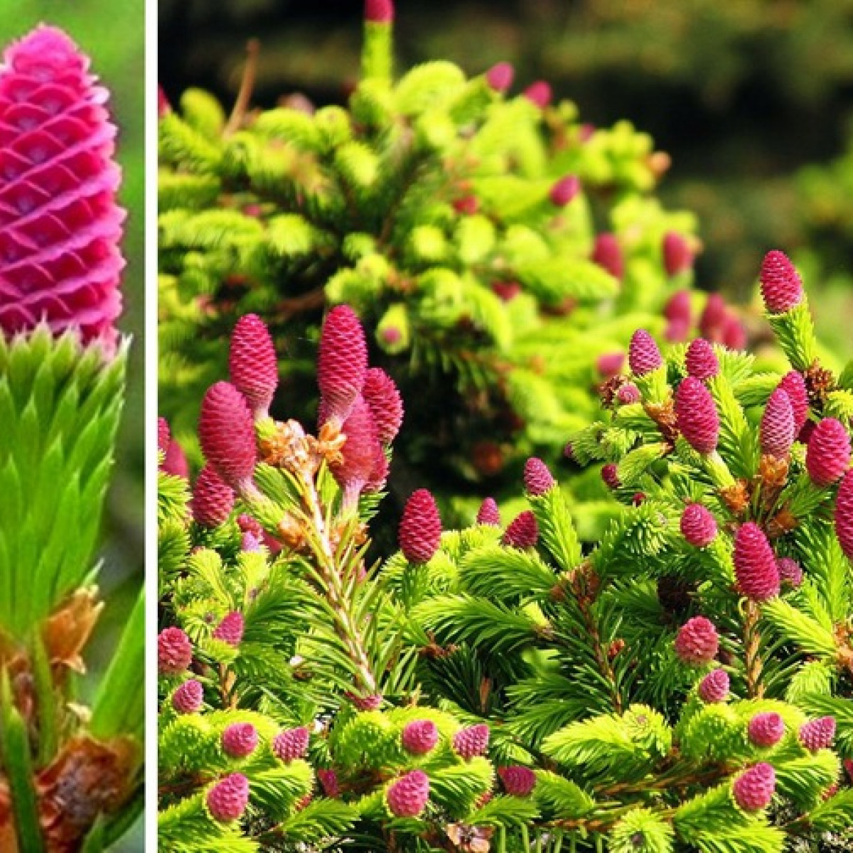 Ель обыкновенная "Acrocona" - некрупный представитель повислых хвойных растений с красноватыми молодыми шишечками.