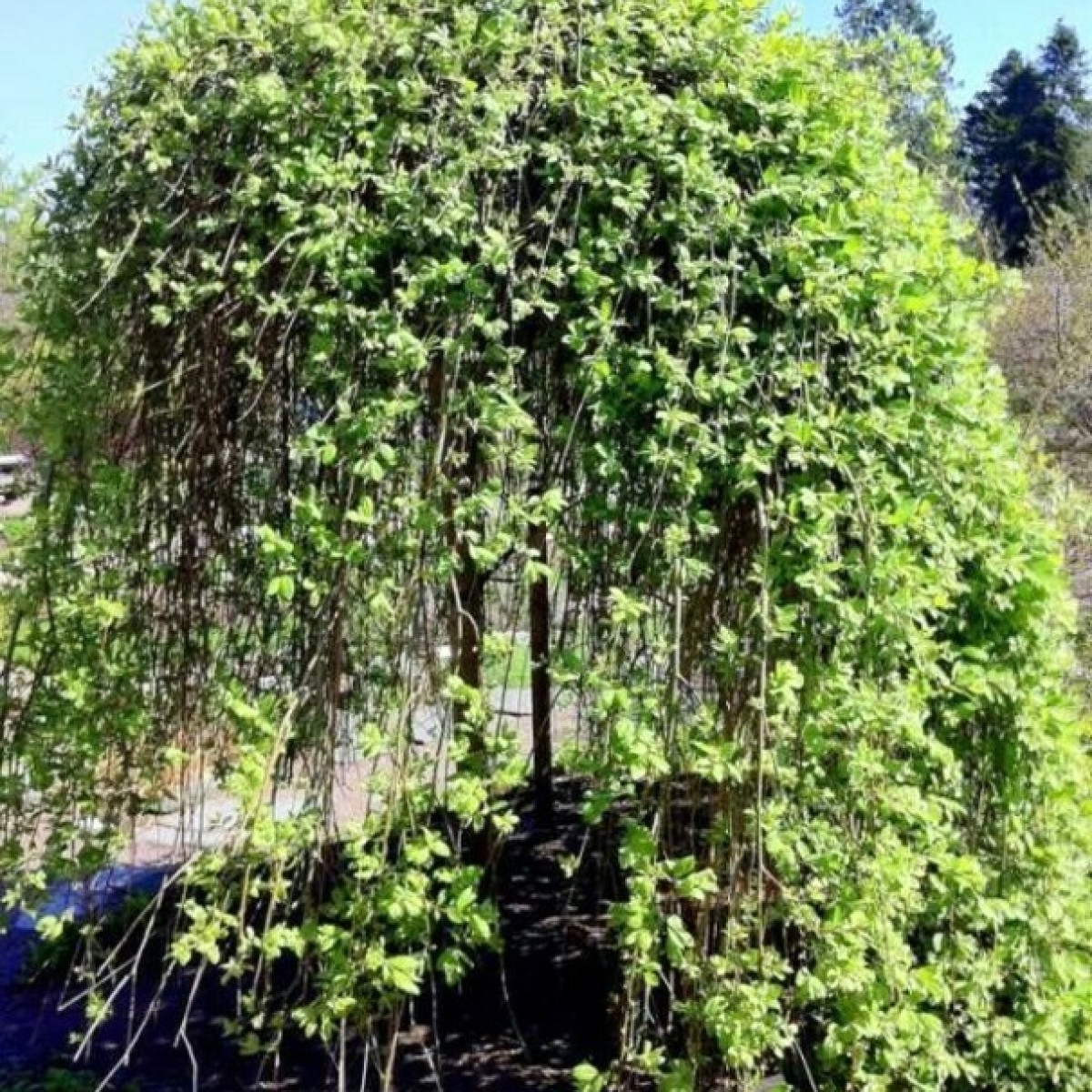 Вырастает небольшой до 3 м, в случае штамба, как правило, её высота не превышает 2 м. Крона сильно плакучая, словно водопад. Побеги довольно жесткие, окрашены в красновато-оливковый оттенок с легким сероватым опушением. Листья бывают как округлой, так и эллипсовидной формы, это зависит от питания и достатка воды. Они окрашены в зеленый цвет без глянца, с обратной стороны обладают характерным мягким ворсом.