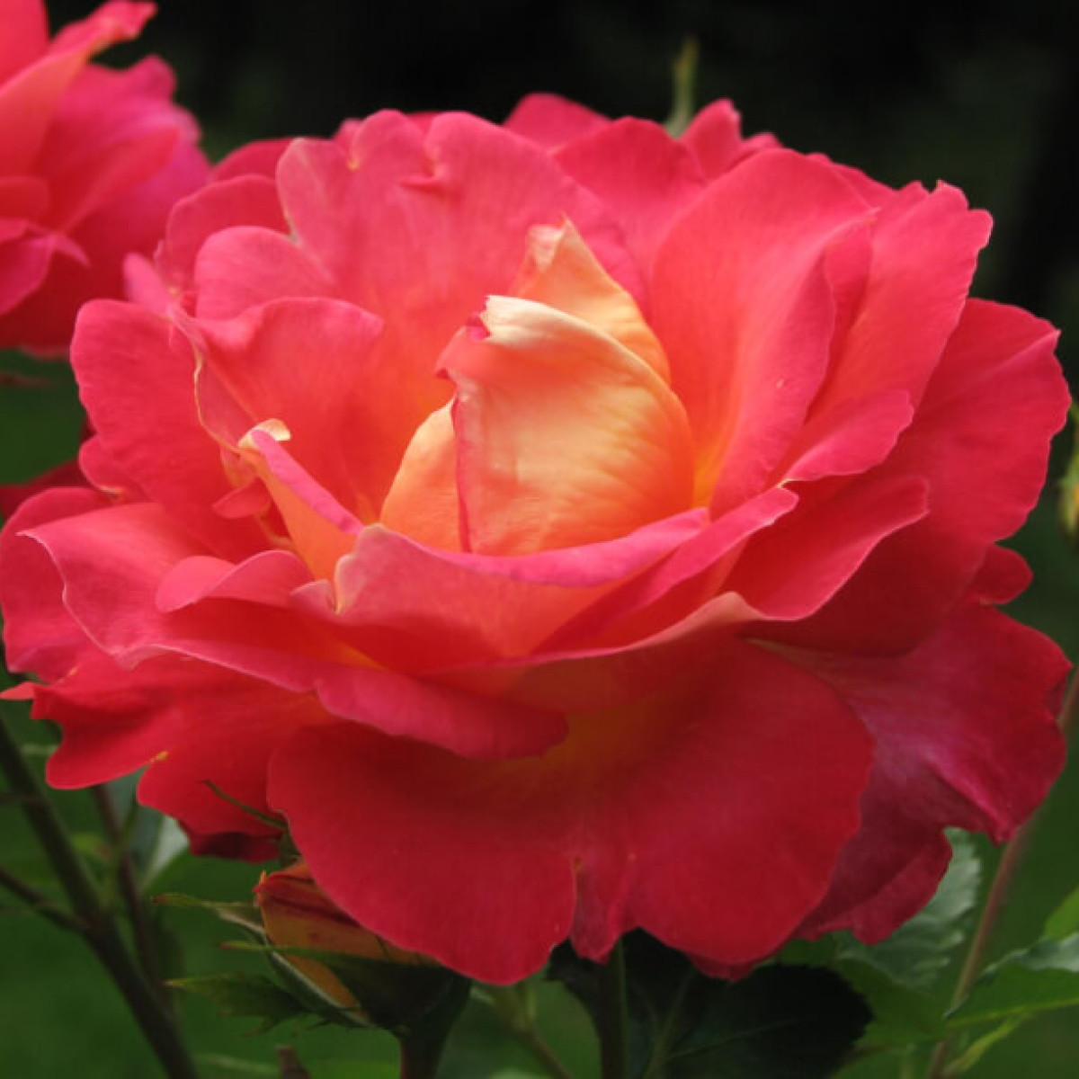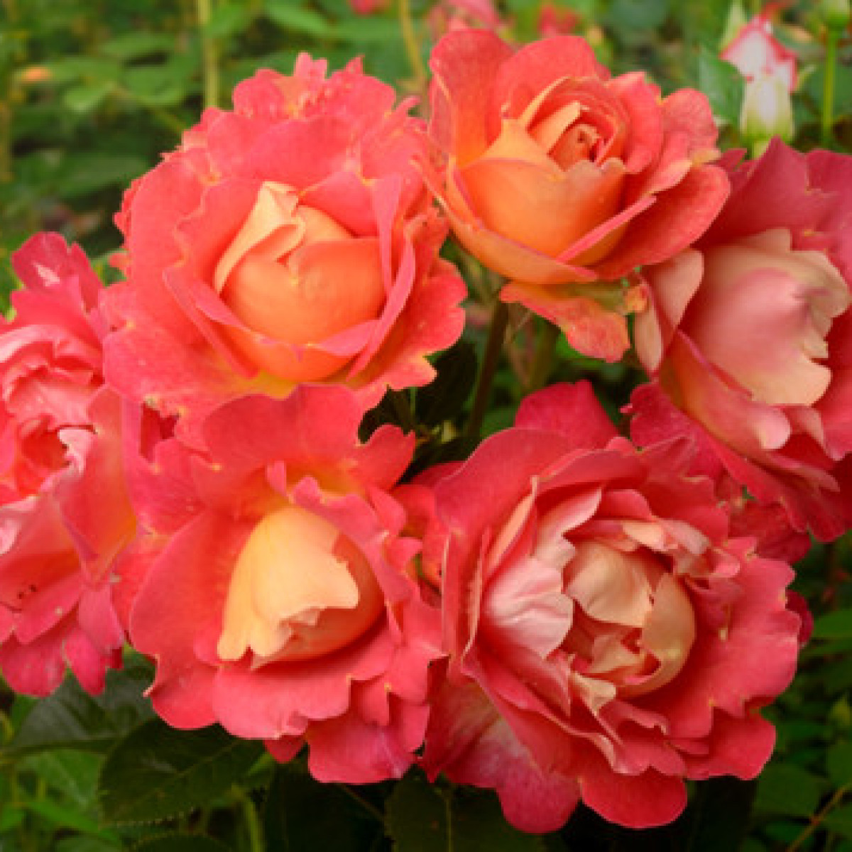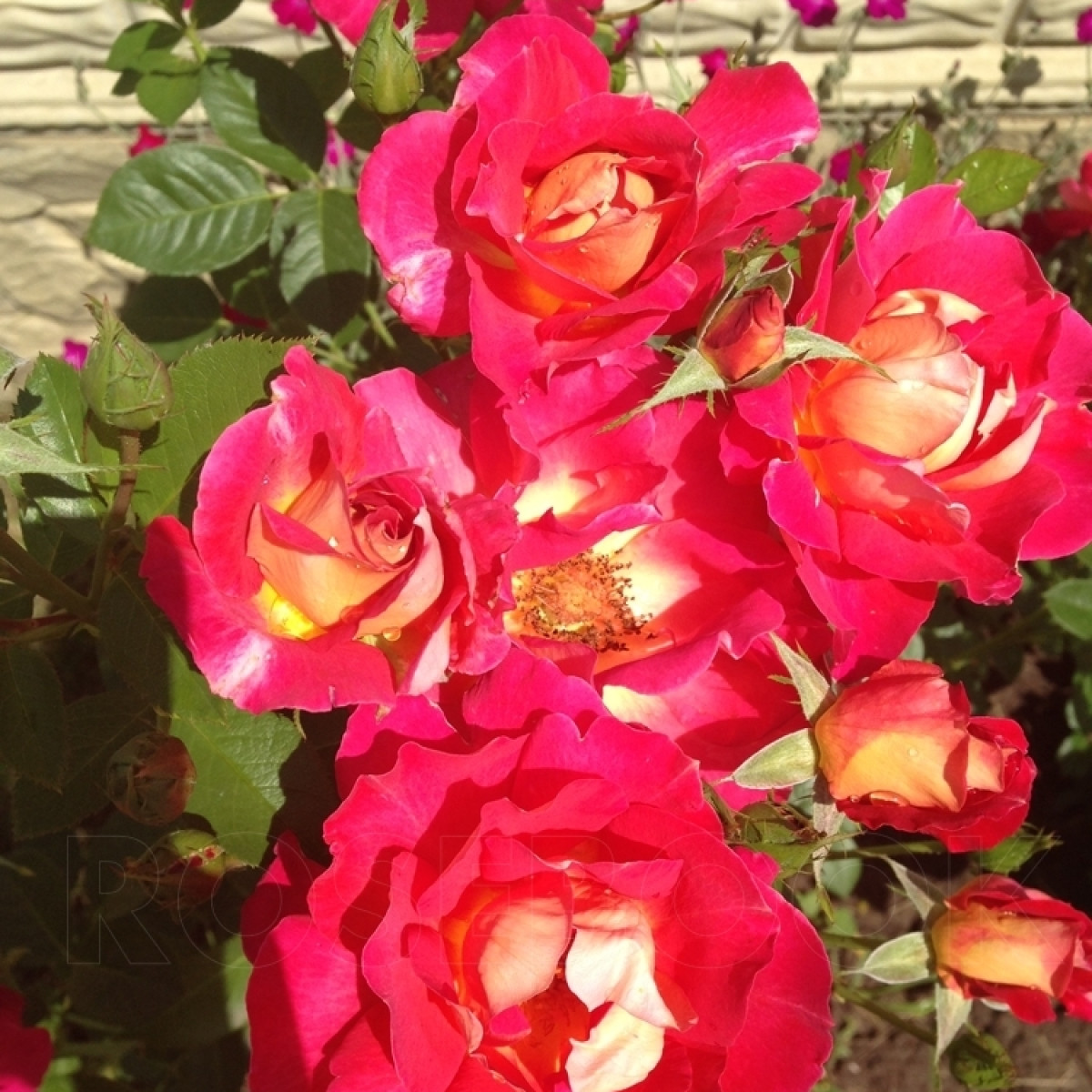 · Цветы крупные, в диаметре — примерно 7–12 см. Особенность — неоднородность окрашивания: бутон имеет тусклый желтовато-оранжевый оттенок, который в период распускания становится розовато-малиновым или насыщенно-клубничным, при этом центральная часть чашечки имеет яркий жёлтый цвет. На кусте сложно найти сразу два одинаковых по окраске цветка.