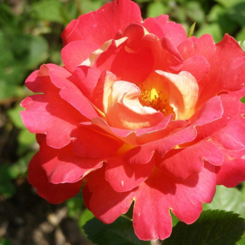 Махровые цветы розы Арлекин переливается от золотого, цвета желтой охры цвета до оттенков апельсина и персика с зеленым основанием. Лепестки махровые, толстые. Цветок достигает до 10-15 см в диаметре и состоит из приблизительно 40 лепестков. Растут розы, как правило, одиночно или в небольших кистях. Роза источает фруктовый насыщенный аромат. Насыщенное непрерывное цветение продолжается с июня до самих заморозков.