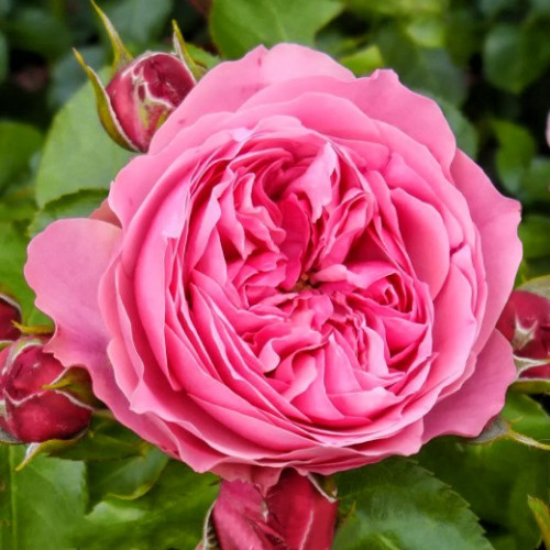 Роза "Leonardo da Vinci" — яркий, великолепный сорт с обильным и долгим цветением. Кусты аккуратные, очень компактные: всего 0,6 м в диаметре и до 1,1 м в высоту. Стебли вертикальные, прочные, с редкими, светло-красными шипами. Листва крупная, густая, с глянцевой поверхностью. Она темно-зеленая, эффектно контрастирует с сочной окраской бутонов и цветов. Цветет сорт практически непрерывно, с июня и по сентябрь. Бокаловидные бутоны постепенно раскрываются в нежные, густомахровые цветы с выразительной окраской лепестков. Он насыщенно розовый, с малиновым подтоном. Цветы сохраняют яркость и форму даже при постоянном контакте с ярким солнцем и осадками. Аромат слабый, но тонкий, со сладкими нотами.