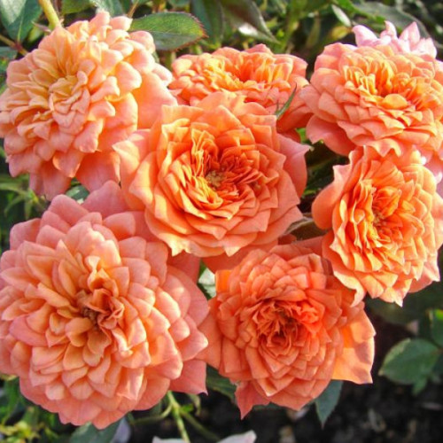 Роза Нинетта - Цветок темно-оранжевый, при распускании становится персиковым, розетковидный, махровый (39 - 55 лепестков), обладает легким ароматом. Диаметр 4-5 см. Цветение обильное, непрерывное, цветки собраны в соцветия, на одном цветоносе в период массового цветения насчитывается 5-10 цветков одновременно. Растение мощное, густое, высота куста 30-40 см, ширина 40 см. Лист оливково-зеленый, мелкий, глянцевый.