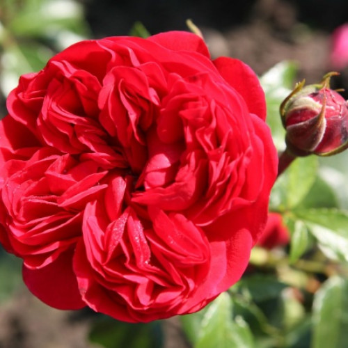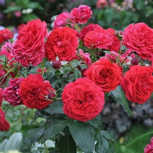 Роза "Out of Rosenheim" с густомахровыми (около 40 лепестков) романтическими чашевидными цветками диаметром 8-9 см ярко-красного цвета, с очаровательным сложением лепестков. Цветение проходит в соцветиях. Аромат отсутствует. Цветение обильное, почти непрерывное. Листья удлинённые, тёмно-зелёные, глянцевые, с высокой устойчивостью к заболеваниям. Сорт получил своё название в честь города Розенхайм.