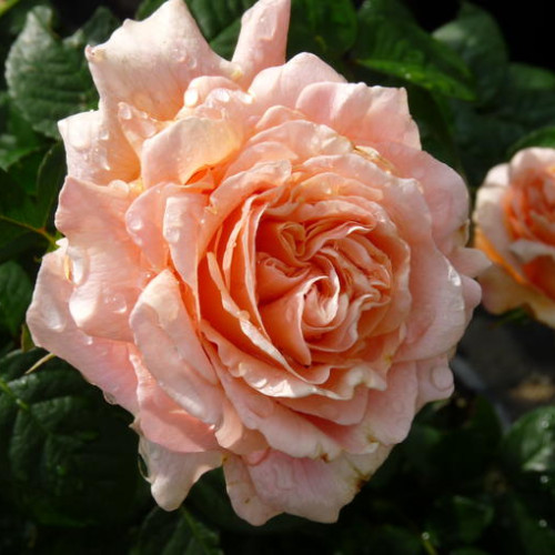Роза Полька плетистая - Цветки махровые, средние или крупные, появляются по одному или в небольших кистях на концах жестких побегов. Они медно-лососевые, выгорают до лососево-розовых, но в глубине цветка сохраняют медные тона. Аромат очень слабый. Идеальна для столбов, стен и изгородей, где нужна невысокая плетистая роза. Куст сильнорослый, довольно ветвистый, листва обильная, блестящая. Ветвистый куст достигает 2,5-3 м в высоту.