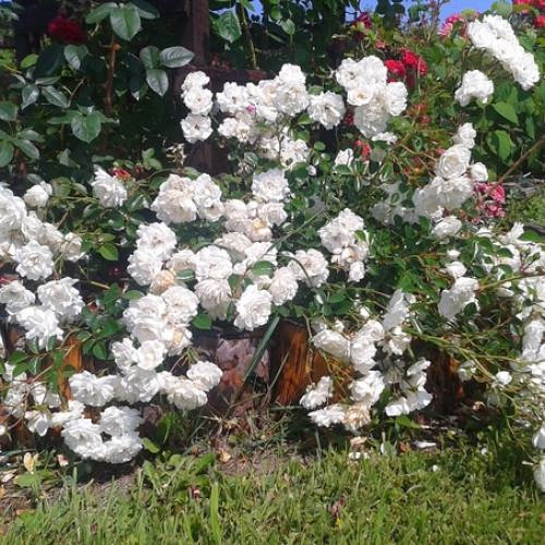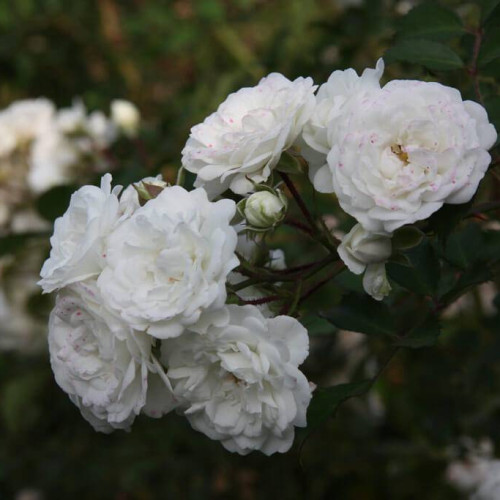 Это роза – первая почвопокровная роза, выведенная Мейяном, и до сих пор одна из лучших. Swany сочетает гены двух вечнозеленых роз, Rosa sempervirens и Rosa wichurana, но, вместо того, чтоб быть сильнорослой плетистой розой, формирует раскидистый обильноцветущий куст. Цветки чистого белого цвета, с нежно-розовым тоном в центре, когда только распустятся, густомахровые, в форме розеток. Появляются в кистях по 5-20 шт на довольно длинных стеблях. Листва очень красивая, темно-зеленая, мелкая, блестящая, вечнозеленая. Форма куста выгодно смотрится при посадке на склоне. Можно использовать как невысокую плетистую розу.