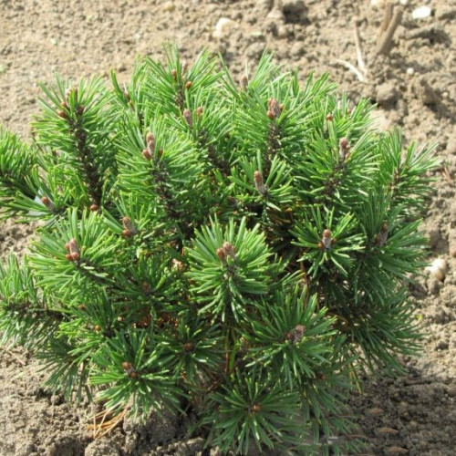 Сосна горная "Kornik" – еще один прекрасный карликовый сорт, который с успехом применяют для оформления ландшафтного дизайна. Густо расположенные побеги формируют плотную шаровидную крону, по всей длине они покрыты короткой острой насыщенно-зеленой хвоей, собранной в пучки. Высота дерева составляет всего 40 см, диаметр – 50-80 см.
