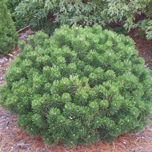 Сосна горная "Sherwood Comact" – один из самых необычных представителей садовых разновидностей среди горных сосен. Невысокое – всего около 60-90 см в высоту – растение привлекает аккуратной компактной формой. Ветви располагаются плотно, прирастая за год всего на 5 см. Саблевидная хвоя насыщенной, «лесной» зеленой окраски короткая, жесткая. Особенность «Шервудского Компакта» – исключительная симметрия побегов одинаковой длины. Эффектность деревца усиливают почки: их кремово-белые свечки за счет выраженного воскового покрытия сверкают в солнечных лучах. Нижние побеги располагаются чуть выше поверхности земли, что придает растению форму пушистого шарообразного кустика, немного приплюснутого сверху.