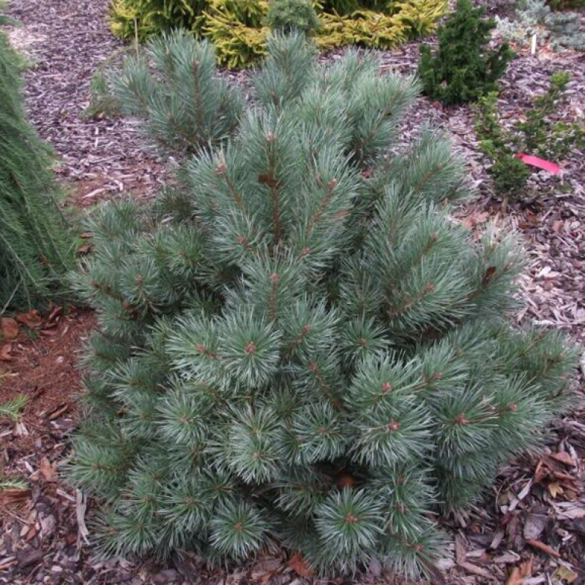 Побеги направлены вверх либо под углом вверх. Хвоя - длинная, мягкая, на солнечных участках голубая, а в затененных местах может приобретать также зеленоватый оттенок. Малочисленные шишки, образуются только на взрослом растении. По форме шишки яйцевидные, длиной 3-7 см, серовато-бурые (в созревшем состоянии), располагаются одиночно или группами, на загнутых вниз ножках.