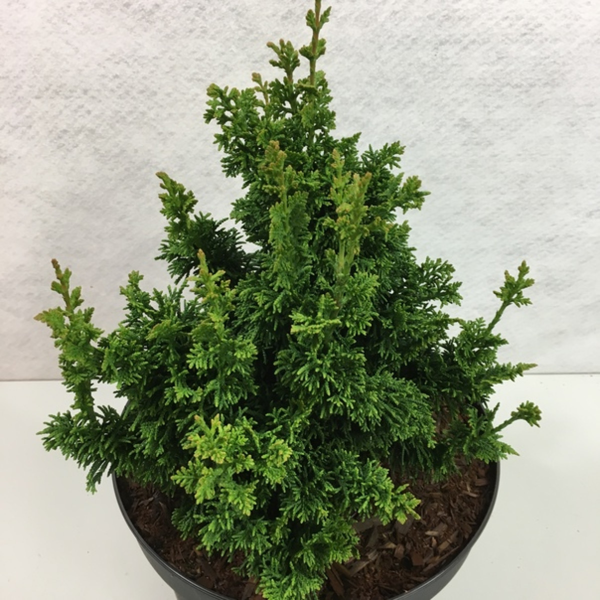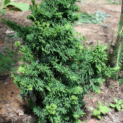 Хвоя достаточно мелкая, имеет чешуйки, расположена густо, плотно прилегает к стеблям. Верхняя часть имеет ярко-зеленую окраску, нижняя – матовая. К зимнему периоду окраска приобретает темный оттенок. на дереве хвоя держится около 3 лет, затем начинается ее опадение вместе с верхней частью побега. У молодых побегов хвоя имеет окраску чуть светлее, чем у побегов прошлого года. Размер взрослого растения (в 25-30 лет) достигает 2 метров, ширина 1 метр. Размер в 10 лет: всего 50-70 см в высоту. Годовой прирост составляет 5-7 см. Форма кроны: неправильная, причудливая, с несколькими вершинами.